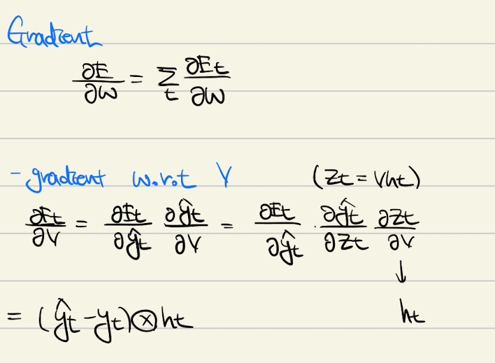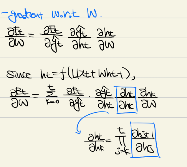 좀 다르게, W에 대한 gradient는 뒷 state 에도 영향을 받습니다. 여기서 파랑 네모에 있는 부분을 보면, gradient가 이전 state들에서의 gradient의 곱으로 계산되는 부분이 있는데, 흔히 gradient가 0 에서 1 사이의 값을 갖는 것을 생각하면 (tanh, sigmoid) gradient vanishing, 혹은 exploding현상이 쉽게 발생하는 것을 이해할 수 있습니다.