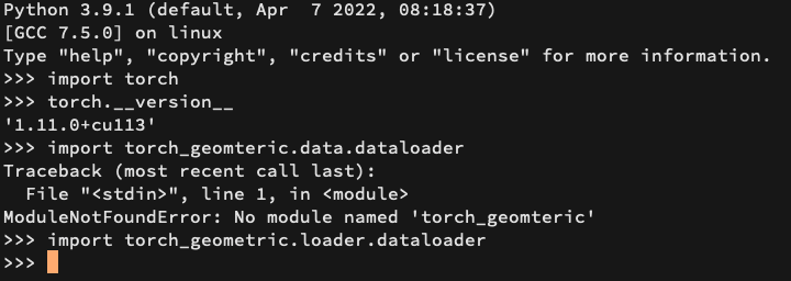 이 경우 pytorch-geometric 의 data.dataloader 를 가져오지 못하는 문제가 발생합니다.