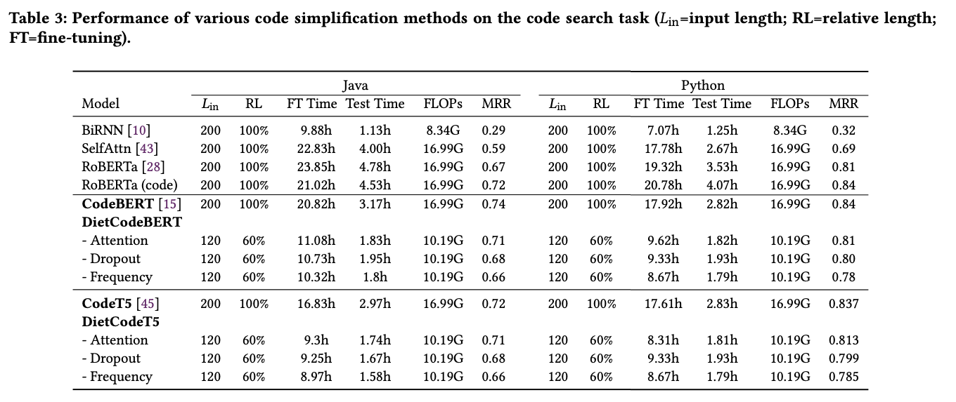 결과적으로 CodeBERT, CodeT5에 대하여 DietCodeBERT, DietCodeT5를 보면, Finetuning Time (FT Time), 그리고 FLOPs가 크게 줄어듬에도 MRR (Code search metric)은 크게 감소하지 않는 것을 볼 수 있죠. 본 논문의 방식을 사용하면 들어온 코드를 확 줄여버림으로써 메모리나 시간을 아낄 수 있으면서도, 성능은 어느 정도 유지할 수 있다는 것을 보였네요.