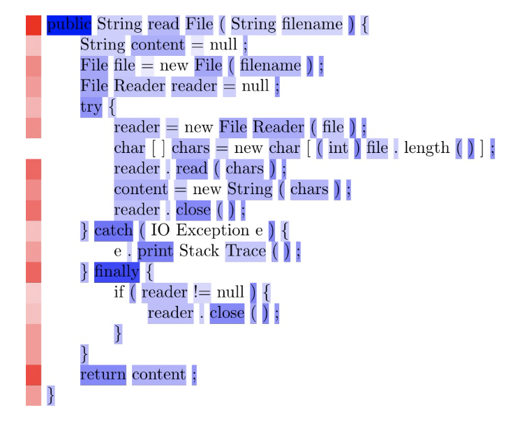 아래 그림에 모아진 attention 값에 따라 highlight 을 해두었습니다. (blue: token, red: stmt)